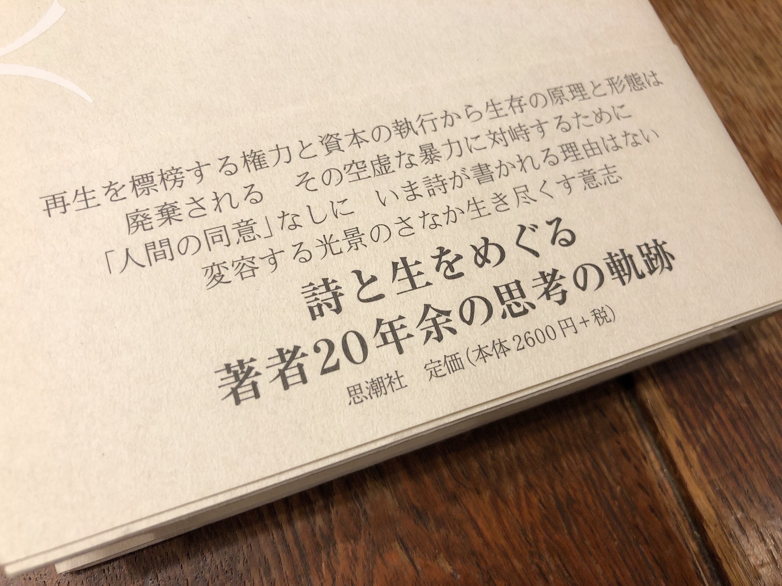再生を標榜する権力と資本の執行から、生存の原理と形態は廃棄される。その空虚な暴力に対峙するために、「人間の同意」なしに、いま詩が書かれる理由はない。変容する光景のさなか生き尽くす意志。詩と生をめぐる著者20年余の思考の軌跡。著者自装。