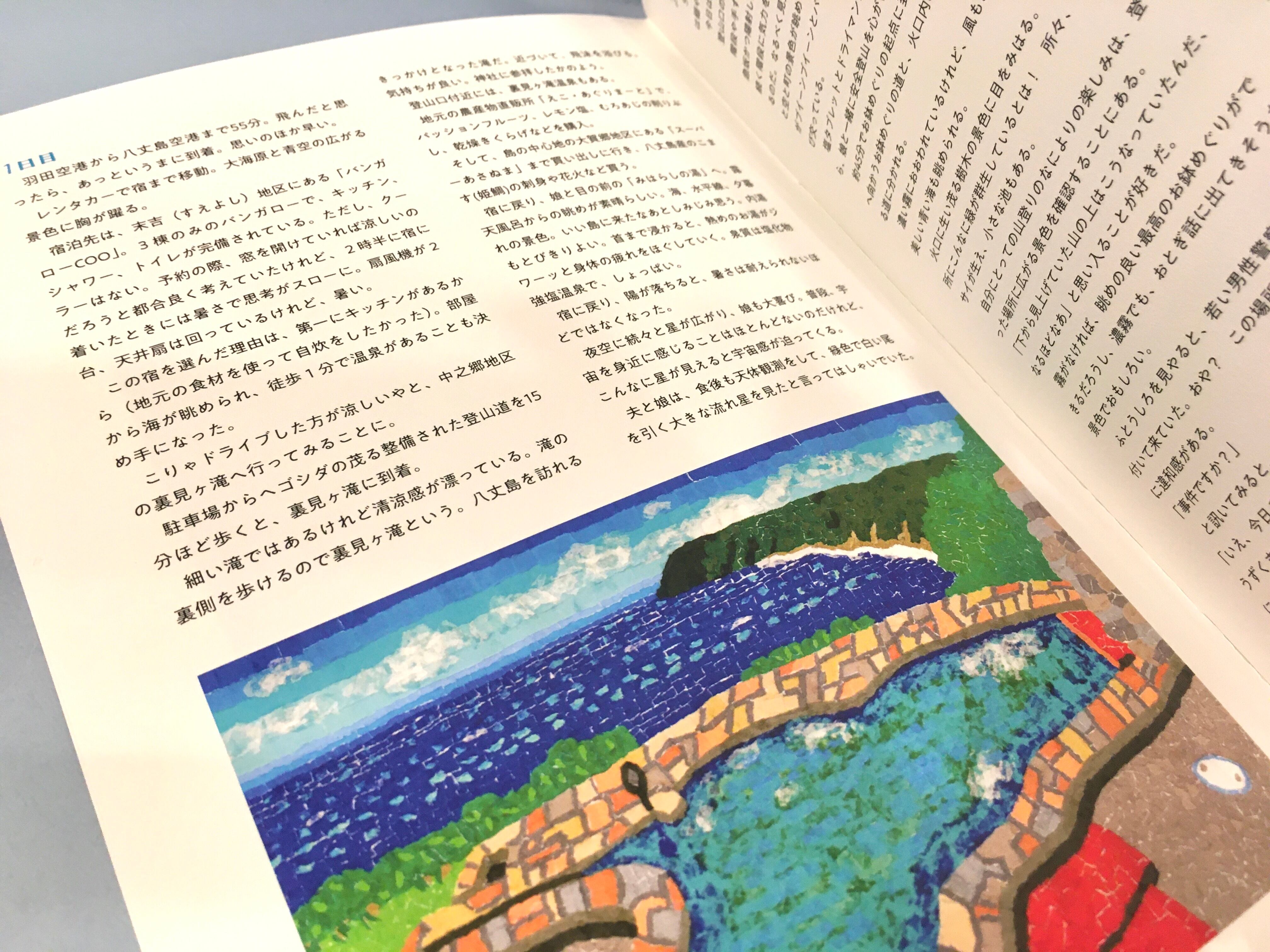 八丈島への3泊4日の旅の様子がちぎり絵とともに紹介されています。